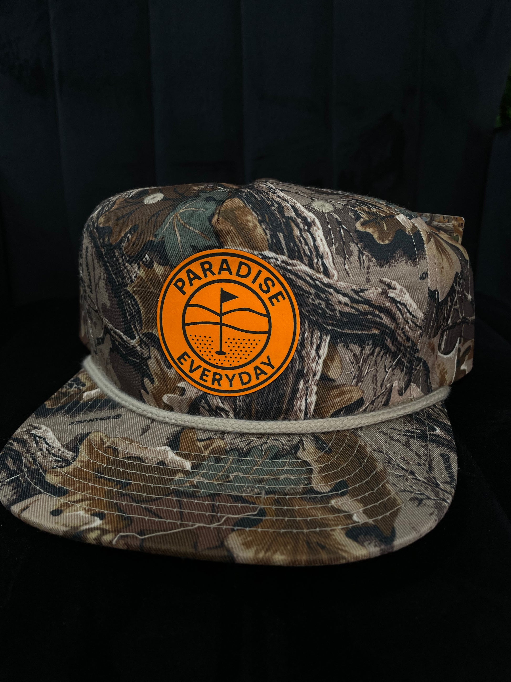 Stand out on and off the course with our paradise every day real tree camo hat. Featuring a bold blaze – orange paradise every day, patch front and center, this structured rope at combines, classic outdoor style with modern golf vibes. Adjustable snapback fit, insures all day comfort, whether you're chasing birdies or just wrap in the lifestyle.