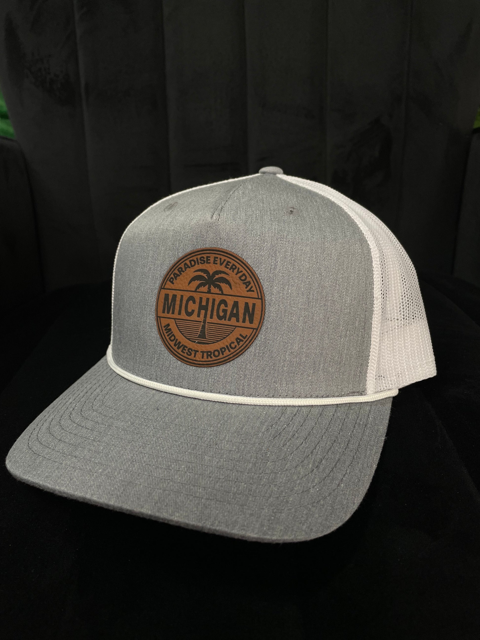 This gray and white Michigan Midwest, tropical trucker hat is a fresh twist on a classic look. With a heather, gray front, crisp, white mesh, and leather look patch letting everybody know that in Michigan everyday is paradise. This snapback delivers comfort and style whether you're out on the course, the water, or the town.